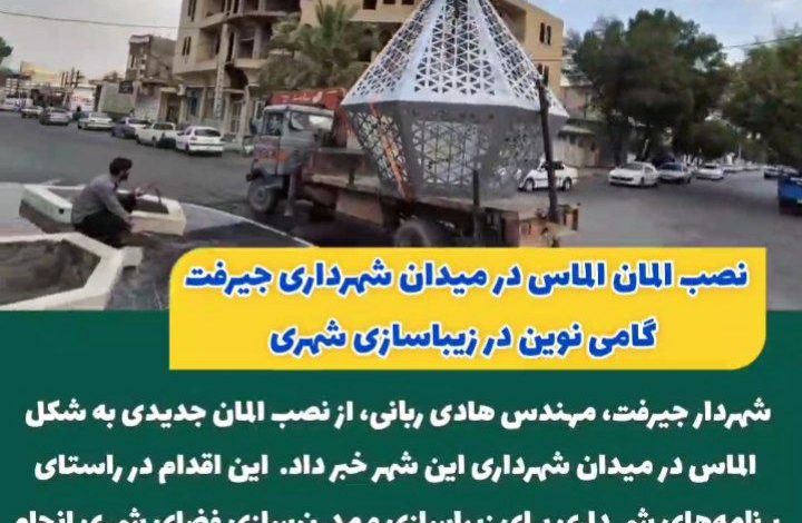 به گزارش پایگاه خبری جنوب زیبا ، شهردار جیرفت، مهندس هادی ربانی، از نصب المان جدیدی به شکل الماس در میدان شهرداری این شهر خبر داد. این اقدام در راستای برنامههای شهرداری برای زیباسازی و مدرنسازی فضای شهری انجام میشود. شهردار جیرفت تأکید کرده است که با اجرای طرحهای مدرن و نصب المانهای شهری، بهزودی شاهد تحولات چشمگیری در حوزه زیباسازی، زیرسازی و آسفالت معابر خواهیم بود.