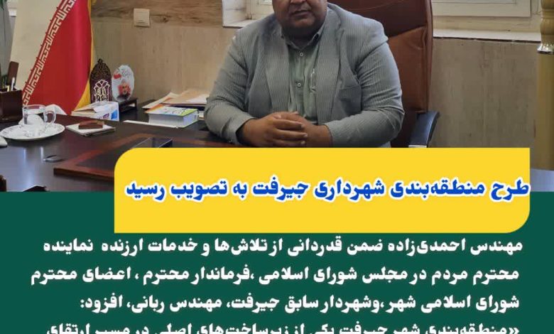 سرپرست شهرداری جیرفت با اعلام این خبر اظهار داشت: «طرح منطقهبندی شهرداری جیرفت روز گذشته توسط وزیر محترم کشور امضا شد و در آینده نزدیک برای اجرا به شهرداری ابلاغ خواهد شد.»