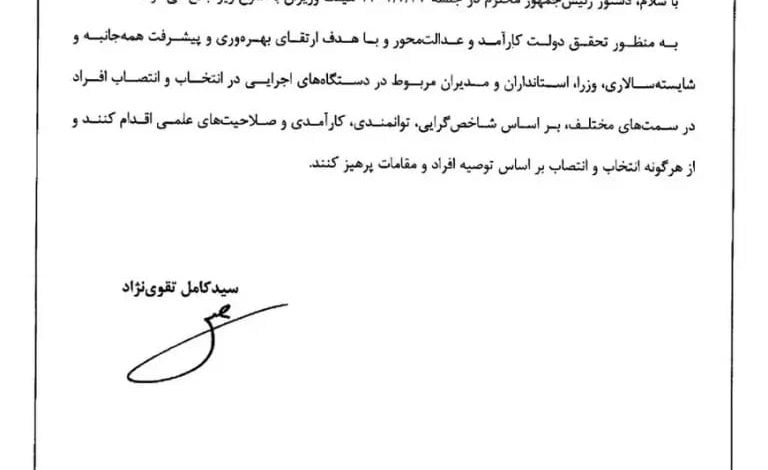 بخشنامه ابلاغ دستور رئیسجمهور در پرهیز از انتصاب مدیران بر اساس توصیه افراد و مقامات