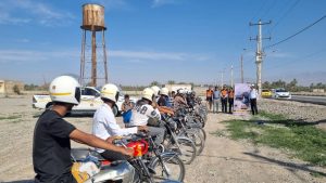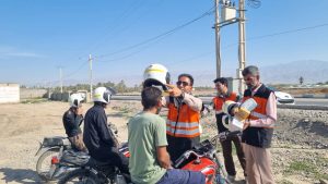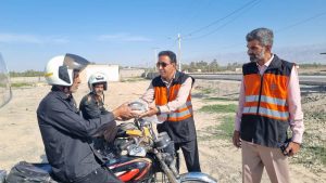 توزیع کلاه ایمنی، برچسب شبرنگ و چراغ بین موتورسواران در جیرفت
