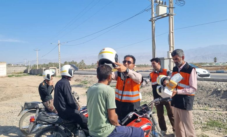 توزیع کلاه ایمنی، برچسب شبرنگ و چراغ بین موتورسواران در جیرفت انجام شد