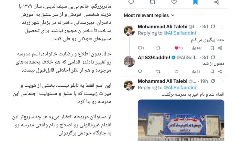 کمتر از چند روز بعد، نتیجه پیگیریها منتشر شد؛ نام مرحومه «بیبی سیفالدینی» بار دیگر بر سردر مدرسه نقش بست و هویت واقعی این بنای خیرساز به آن بازگردانده شد. تصویری که توسط استاندار منتشر شد، نشان میدهد که تابلو جدید نصب شده و مدرسه دوباره به نام بانیاش افتخار میکند.