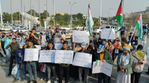 دانشجویان در این تجمع که ساعاتی طول کشید با در دست داشتن پرچم فلسطین و دست نوشته هایی با سر دادن شعارهایی آمادگی حضور در جبهه های جنگ شدند.