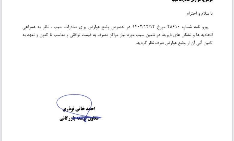 به گزارش پایگاه خبری جنوب زیبا به نقل از روابط عمومی کنفدراسیون صادرات ایران، با پیگیریهای این رسانه و همچنین تلاشهای صورت گرفته از سوی قائم مقام تجارت و تنظیم بازار وزیر جهاد کشاورزی و پیگیریهای کمیسیون توسعه صادرات غیرنفتی اتاق بازرگانی ایران، عوارض صادراتی سیب لغو شد.